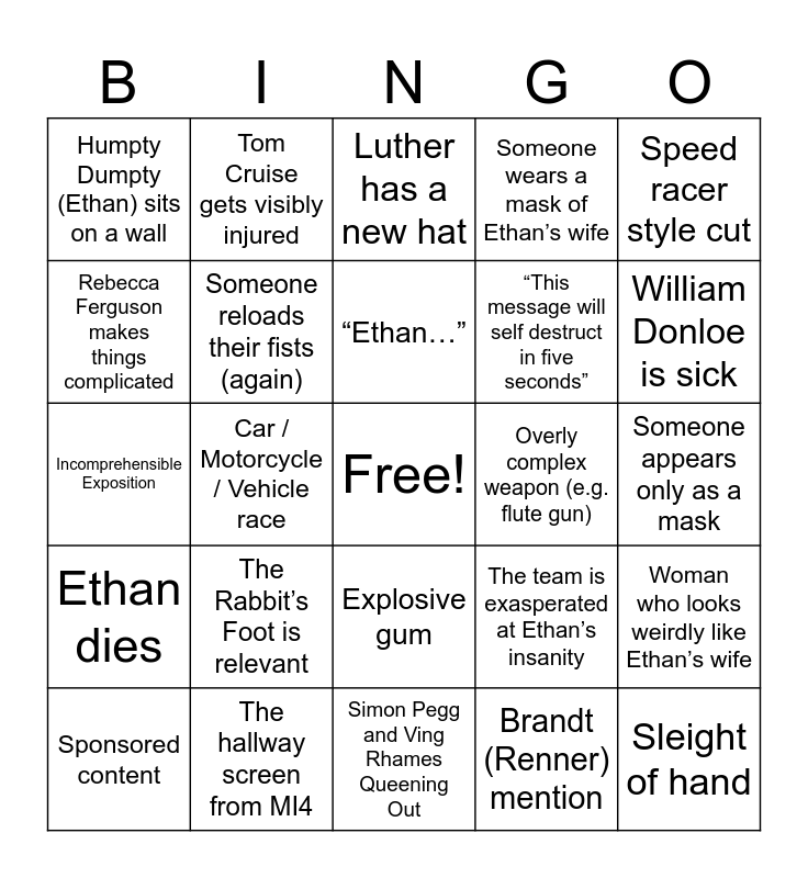This bingo card has a free space and 24 words: The Rabbit’s Foot is relevant, The hallway screen from MI4, “Ethan…”, Sponsored content, Speed racer style cut, Humpty Dumpty (Ethan) sits on a wall, Rebecca Ferguson makes things complicated, Tom Cruise gets visibly injured, Overly complex weapon (e.g. flute gun), Explosive gum, “This message will self destruct in five seconds”, Incomprehensible Exposition, The team is exasperated at Ethan’s insanity, Woman who looks weirdly like Ethan’s wife, Someone reloads their fists (again), Brandt (Renner) mention, Someone appears only as a mask, Luther has a new hat, William Donloe is sick, Car / Motorcycle / Vehicle race, Sleight of hand, Ethan dies, Someone wears a mask of Ethan’s wife and Simon Pegg and Ving Rhames Queening Out.