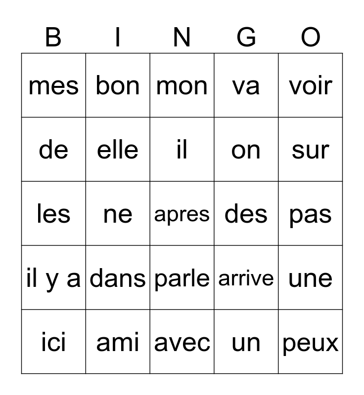 This bingo card has 28 words: une, est, on, un, de, mon, bon, il y a, des, ici, les, va, ami, avec, sur, la, dans, elle, il, parle, mes, peux, apres, ne, pas, arrive, voir and est-ce que.