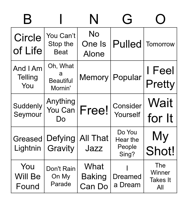 This bingo card has a free space and 24 words: Defying Gravity, Don't Rain On My Parade, Memory, You Will Be Found, Tomorrow, Circle of Life, And I Am Telling You, You Can’t Stop the Beat, Consider Yourself, All That Jazz, Popular, Suddenly Seymour, Do You Hear the People Sing?, My Shot!, Oh, What a Beautiful Mornin', I Dreamed a Dream, Wait for It, No One Is Alone, I Feel Pretty, Anything You Can Do, The Winner Takes It All, Greased Lightnin, Pulled and What Baking Can Do.