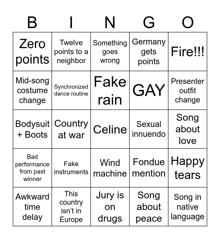 This bingo card has a free space and 24 words: Fake instruments, This country isn’t in Europe, Fake rain, Awkward time delay, Fire!!!, Zero points, Mid-song costume change, Twelve points to a neighbor, Sexual innuendo, Wind machine, GAY, Bodysuit + Boots, Fondue mention, Happy tears, Synchronized dance routine, Song about peace, Song about love, Something goes wrong, Presenter outfit change, Country at war, Song in native language, Bad performance from past winner, Germany gets points and Jury is on drugs.