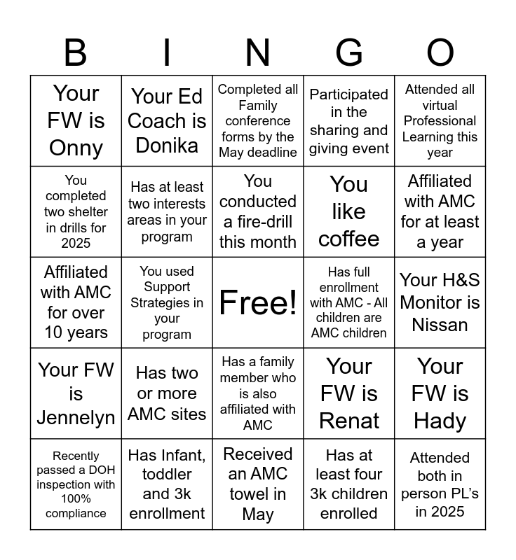 This bingo card has a free space and 45 words: Completed or renewed CDA IN 2025, Attended both in person PL’s in 2025, Has at 3 infants enrolled in program, Recently passed a DOH inspection with 100% compliance, Implemented AMC Values each month, Has at least four 3k children enrolled, Completed all Family conference forms by the May deadline, Had two newly enrolled children this year, Attended all virtual Professional Learning this year, Has Infant, toddler and 3k enrollment, Participated in the sharing and giving event, Has full enrollment with AMC - All children are AMC children, Has a family member who is also affiliated with AMC, Has two or more AMC sites, Only has 3k enrollment, Received an AMC towel in May, Received an AMC chess set in May, Affiliated with AMC for over 10 years, Affiliated with AMC for over 5 years, Affiliated with AMC for at least a year, Your Ed Coach is Donika, Your H&S Monitor is Emin, Your H&S Monitor is Maria, Your FW is Onny, Your Ed Coach is Nicole, Your H&S Monitor is Nissan, Your H&S Monitor is Marlene, Your FW is Anna, Your FW is Renat, Your FW is Jennelyn, Your Ed Coach is Ayanna, Your FW is Hady, Your FW is Shaina, Your Ed Coach is Svetlana, You can speak more than one language, You used Support Strategies in your program, You completed TSG Checkpoints by the May deadline, You teach in two languages, You know how to cook, You conducted a fire-drill this month, You completed two shelter in drills for 2025, You like coffee, You are a parent, Has at least two interests areas in your program and Implemented at least 1 creative curriculum study this year.