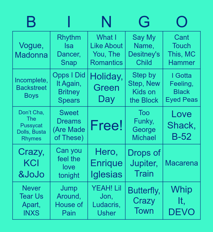 This bingo card has a free space and 25 words: Can you feel the love tonight, YEAH! Lil Jon, Ludacris, Usher, Holiday, Green Day, Never Tear Us Apart, INXS, Cant Touch This, MC Hammer, Vogue, Madonna, Incomplete, Backstreet Boys, Rhythm Isa Dancer, Snap, Too Funky, George Michael, Hero, Enrique Iglesias, Step by Step, New Kids on the Block, Don’t Cha, The Pussycat Dolls, Busta Rhymes, Drops of Jupiter, Train, Macarena, Opps I Did It Again, Britney Spears, Kiss From A Rose, Seal, Love Shack, B-52, What I Like About You, The Romantics, I Gotta Feeling, Black Eyed Peas, Sweet Dreams (Are Made of These), Whip It, DEVO, Jump Around, House of Pain, Crazy, KCI &JoJo, Say My Name, Desitney's Child and Butterfly, Crazy Town.