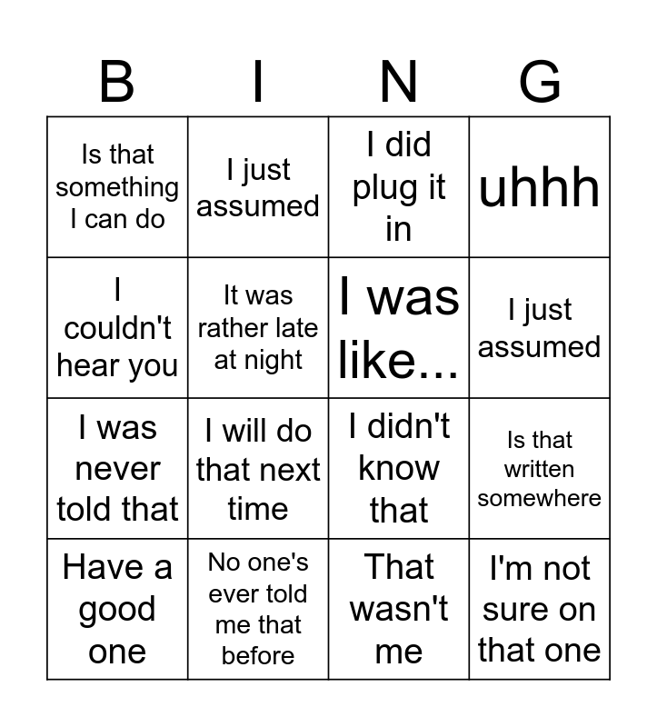 This bingo card has 19 words: I didn't know that, My bad, I did plug it in, I'm not sure on that one, Is that written somewhere, I couldn't hear you, That wasn't me, Is that something I can do, I just assumed, I was never told that, I will do that next time, It was rather late at night, I was like..., No one's ever told me that before, Have a good one, Let me go ask someone, uhhh, I just assumed and I don't have access to that.