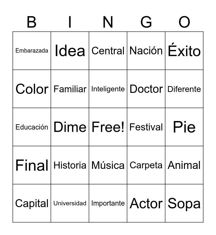 This bingo card has a free space and 28 words: Animal, Hospital, Doctor, Actor, Color, Central, Idea, Final, Festival, Capital, Educación, Nación, Universidad, Importante, Diferente, atención, Historia, Familiar, Inteligente, Música, Embarazada, Ropa, Sopa, Dime, Pie, Carpeta, Éxito and Recordar.