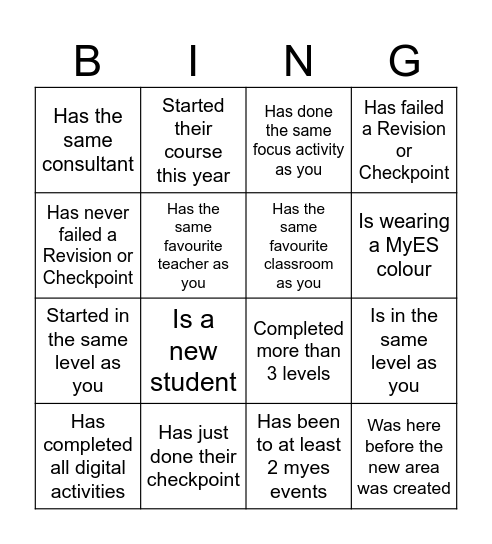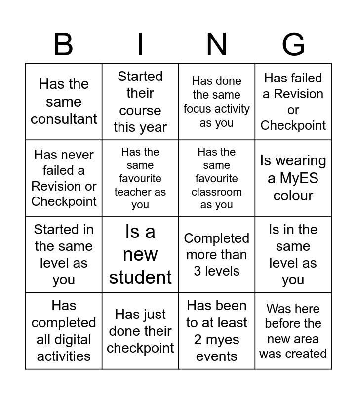 This bingo card has 16 words: Has just done their checkpoint, Is in the same level as you, Has done the same focus activity as you, Has the same consultant, Started in the same level as you, Started their course this year, Completed more than 3 levels, Has been to at least 2 myes events, Has never failed a Revision or Checkpoint, Has the same favourite teacher as you, Has completed all digital activities, Has failed a Revision or Checkpoint, Is a new student, Is wearing a MyES colour, Has the same favourite classroom as you and Was here before the new area was created.