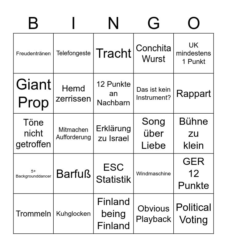This bingo card has 100 words: Fake Rain, 2000er Rufen an, Bühne zu klein, Streichinstrument, GRE -> CYR 12 Points, CYR -> GRE 12 Points, Eifelturm im Bild, Song ist mehrsprachig, Refrain besteht aus Lalala, Moderator*in 3+ Outfits, 3+ Outfits im Act, "Grand Prix", Erneute Teilnahme der Familie, Kuhglocken, 12 Punkte falsch angesagt, Haushaltsutensil, Das ist kein Instrument?, Pyromanie, This Girl is on fire, Flag Facepaint, Albanische Flagge, Booing, Thanking Host Country, "Die Schweiz ist das beste Land", Würstchen, Song über Liebe, UK mindestens 1 Punkt, Windmaschine, This is not in Europe!, Glitter Canon, Mitmachen Aufforderung, Freudentränen, Publikumsvote verliert, Another Breakup-Song, Obvious Playback, 12 Punkte an Nachbarn, GER 12 Punkte, UK 12 Points, Awkward timedelay, Political Voting, Flöte, Thorsten Schorn Savage, Töne nicht getroffen, Zuzwinkern, Rappart, Tracht, Viel zu wenig an, Song About Peace, Shoulder Pads, Finland being Finland, Schweden gewinnt, Act pfeift, SMA-> ITA 12 Points, Discokugel, Moderator Super Funny (Sarcasm), Emo, Stage Dive, Fondue, 90s Sound, Conchita Wurst, Celine Dion, Flügel, Elton, Sunglasses indoor, Supernerviges Medley, BLING BLING PSASS, Amer. Star, Shorts, Song About Hero(es), Emotional Backstory, Dance Solo, Barfuß, Mispronounced Country, Flag worn as cape, Awkward Greenroom, Technical Difficulties, Awkward Silence, Giant Prop, Punktevergabe Erklärung, Ganzkörperkondom, Good Morning Australia, Erklärung zu Israel, Handherzen, ESC Statistik, Stefan Raab, Telefongeste, Glitteroutfit, "Europe stop voting", Akrobatik, 5+ Backgrounddancer, Duett, GER 0 Points insgesammt, Künstler-Senior, Trommeln, Hemd zerrissen, Kleidung weggerissen, Mata Hari-Moment, Politische Botschaft, United by Music and Land braucht bei Vergabe zu lang.