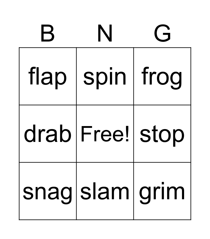 This bingo card has a free space and 20 words: brag, clap, frog, drip, trap, grim, slap, flap, grab, spin, brim, clog, stop, flick, snag, clot, slam, drab, brat and fend.