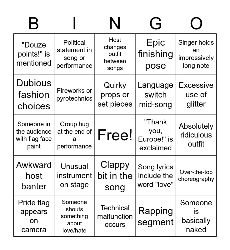 This bingo card has a free space and 38 words: Dramatic key change, Wind machine in action, Mid-song costume change, Fireworks or pyrotechnics, Over-the-top choreography, Unusual instrument on stage, Quirky props or set pieces, Backup dancers steal the spotlight, Singer holds an impressively long note, Language switch mid-song, Group hug at the end of a performance, Epic finishing pose, Someone is basically naked, Absolutely ridiculous outfit, Dubious fashion choices, Awkward host banter, Presenter makes a flat joke, Host changes outfit between songs, Graham Norton roasts a contestant before they perform, "Thank you, Europe!" is exclaimed, "Douze points!" is mentioned, Someone shouts something about love/hate, Excessive use of glitter, Pride flag appears on camera, National stereotypes in song presentation, Technical malfunction occurs, Confetti storm, Audience shines their phone lights, Fake rain (any water) on stage, Feathers in costume or set design, Singing out of tune, Clappy bit in the song, Rapping segment, Political statement in song or performance, Dance break, Song lyrics include the word "love", Someone in the audience with flag face paint and Cameo appearance by previous Eurovision contestant.