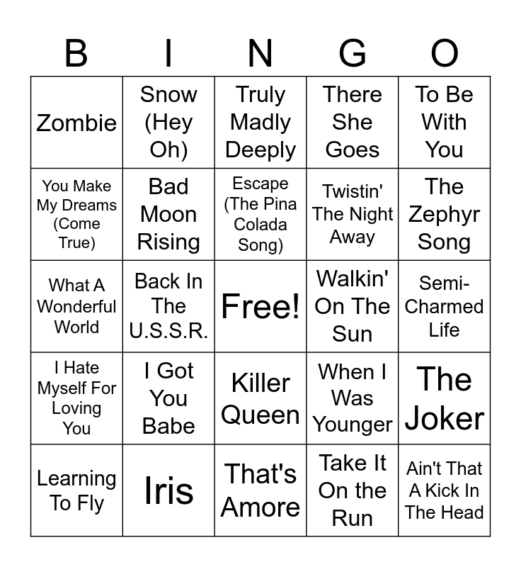 This bingo card has a free space and 45 words: Theme From New York, New York, Ain't That A Kick In The Head, Undercover Angel, Learning To Fly, Sara Smile, Take It On the Run, Truly Madly Deeply, Baby Hold On, To Be With You, Iris, There She Goes, Walkin' On The Sun, Killer Queen, I Got You Babe, Sh-Boom, That's Amore, All I Have To Do Is Dream, What A Wonderful World, Dream On, The Zephyr Song, Snow (Hey Oh), Sunlight, Honey, Zombie, Everlong, Semi-Charmed Life, I Hear You Knocking, No One's Valentine, When I Was Younger, I Hate Myself For Loving You, She Runs Hot, The Joker, New York Groove, Run Run Run, American Girl, Back In The U.S.S.R., I Got A Line On You, Rock and Roll, Uprising, Escape (The Pina Colada Song), You Make My Dreams (Come True), Twistin' The Night Away, Hurts So Good, Bad Moon Rising and Denise.