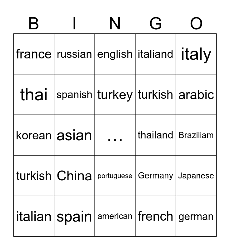 This bingo card has a free space and 24 words: China, spain, turkey, italian, italy, france, thai, russian, thailand, portuguese, turkish, korean, Germany, Japanese, spanish, french, Braziliam, english, arabic, asian, german, turkish, italiand and american.