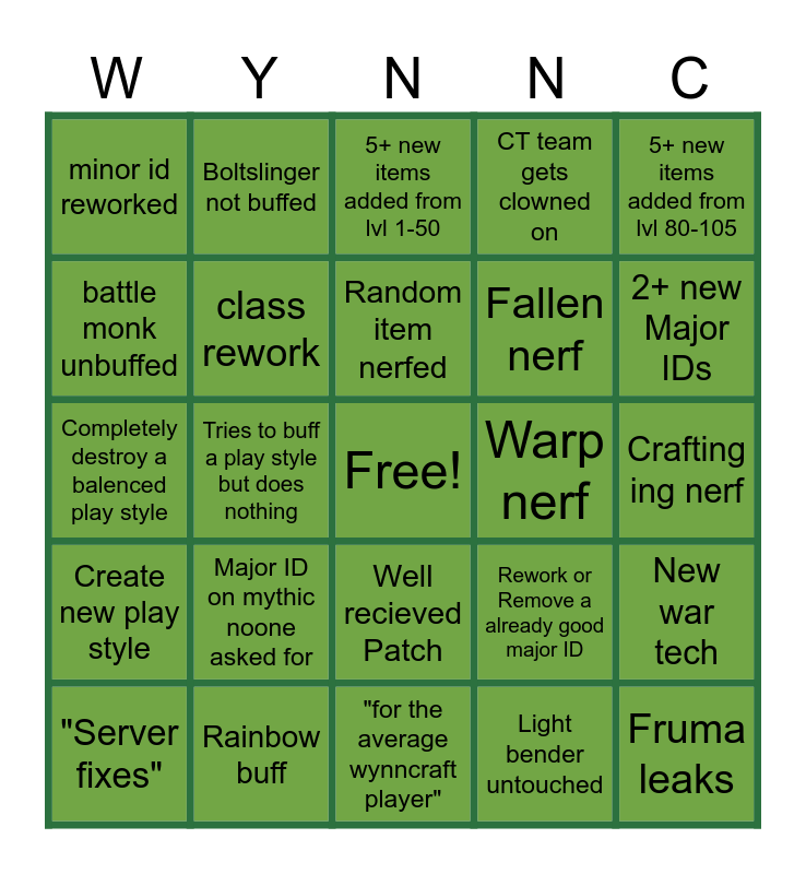 This bingo card has a free space and 24 words: Major ID on mythic noone asked for, Rainbow buff, Random item nerfed, "Server fixes", 5+ new items added from lvl 80-105, minor id reworked, battle monk unbuffed, Boltslinger not buffed, Warp nerf, Well recieved Patch, Fallen nerf, Completely destroy a balenced play style, Rework or Remove a already good major ID, New war tech, class rework, Light bender untouched, Crafting ing nerf, 5+ new items added from lvl 1-50, 2+ new Major IDs, Tries to buff a play style but does nothing, Fruma leaks, Create new play style, CT team gets clowned on and "for the average wynncraft player".