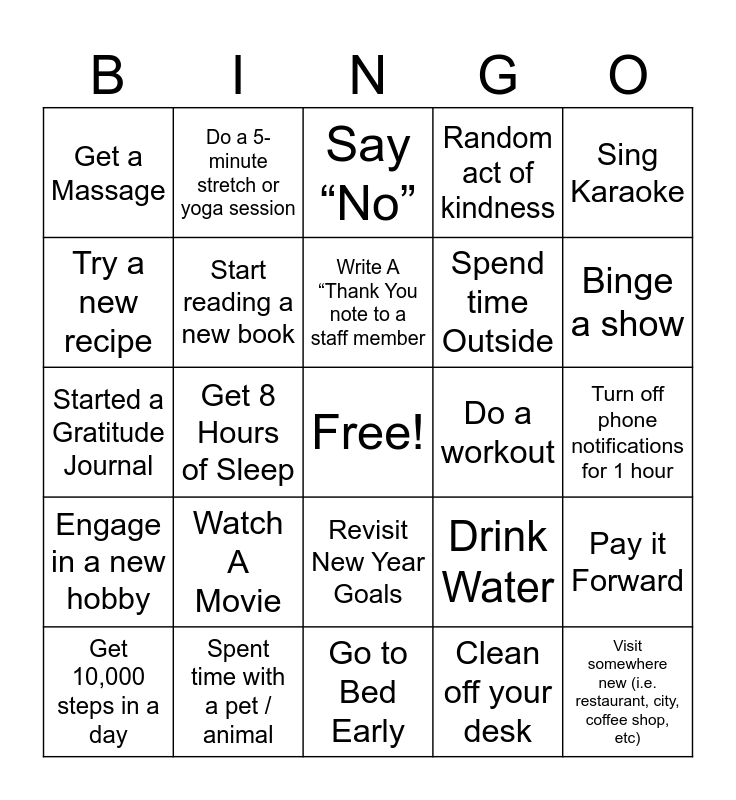 This bingo card has a free space and 25 words: Watch A Movie, Go to Bed Early, Write A “Thank You note to a staff member, Get 10,000 steps in a day, Sing Karaoke, Get a Massage, Try a new recipe, Do a 5-minute stretch or yoga session, Do a workout, Revisit New Year Goals, Spend time Outside, Started a Gratitude Journal, Drink Water, Pay it Forward, Start reading a new book, Listen to new podcast, Turn off phone notifications for 1 hour, Say “No”, Binge a show, Get 8 Hours of Sleep, Visit somewhere new (i.e. restaurant, city, coffee shop, etc), Spent time with a pet / animal, Engage in a new hobby, Random act of kindness and Clean off your desk.