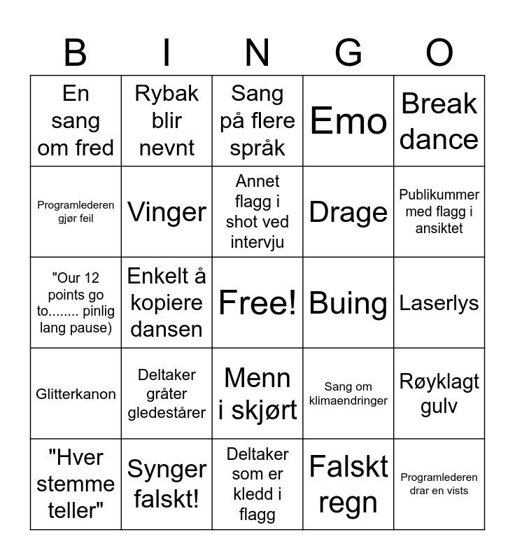 This bingo card has a free space and 86 words: Pinlig tidsforsinkelse, Modulering, Menn i skjørt, Trapp på scenen, Konfransier synger, Innuendo, Norsk flagg i salen, Imobiliserende antrekk, Du tror sangen er over, men den er ikke det, River av seg kostymet, 12 poeng til din favoritt, Noen ligger på scenen, Røyklagt gulv, Laserlys, Publikum synger med på sangen, Annet flagg i shot ved intervju, Dramatisk ballade, Tradisjonelt instrument, Programlederene bytter antrekk, Gitarsolo, Vindmaskin, Tradisjonelt plagg, "Our 12 points go to........ pinlig lang pause), Rapping, Falskt regn, Endre kostyme midt i sangen, Masse fjær, Mer pyro enn nødvendig, ABBA blir nevnt, Takker arrangørland for en FANTASTISK kveld, Synger falskt!, Blunker til kamera, Noen roper "Thank you Europe", Deltaker gråter gledestårer, Programlederen gjør feil, Dommer synger når de gir poeng, Publikummer med flagg i ansiktet, Stemmen sprekker, Publikum synger med på sangen, Enkelt å kopiere dansen, En sang om kjærlighet, Teknisk feil, Ekstraordinær hatt, Buing, LÆR!, Break dance, Nevner land som ikke er Europa, Rybak blir nevnt, Hansker uten fingre, Tydelig miming, Deltaker med ansiktsmaling, Ild!, Glitterkanon, Tydelig politisk stemming, Synkronisert danserutine, Fløytesekvens, Paljetter, Drage, Emo, Vinger, En sang om fred, Diskokule, Tolv poeng til et naboland, Sang på nasjonalspråk, Sang som ikke er på nasjonalspråk, Sang på flere språk, Bruk av tradisjonelle instrumenter, Programlederen drar en vists, Refererer til et tidligere Eurovision øyeblikk, Outfit med lys, Flaut postkort, Tøysete deltaker navn, "Hver stemme teller", Vinneren får mer enn 300 poeng, Sang som ikke er på engelsk, Tørris, Deltaker som er kledd i flagg, Barn som backup sangere, Sang på tullespråk, Deltaker som takker mamma, Synger med solbriller, "United by music", "Nul Points", Deltaker vinker til kamera, Sang om klimaendringer and Deltaker vinker til kamera.