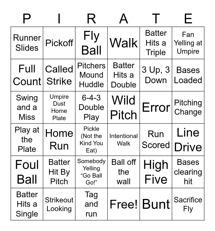This bingo card has 41 words: Free!, 3 Up, 3 Down, Fan Catches Ball in Stands, Full Count, Intentional Walk, Pitching Change, Called Strike, Stolen Base, Batter Hits a Triple, Wild Pitch, Bases Loaded, Walk, Swing and a Miss, 6-4-3 Double Play, Umpire Dust Home Plate, Error, Batter Hits a Single, Runner Slides, Bunt, Fly Ball, Home Run, Foul Ball, Run Scored, Pitchers Mound Huddle, Sacrifice Fly, High Five, Line Drive, RBI, Batter Hits a Double, Batter Hit By Pitch, Caught Stealing, Pickoff, Pickle (Not the Kind You Eat), Strikeout Looking, Play at the Plate, Fan Yelling at Umpire, Somebody Yelling “Go Ball Go!”, Bases clearing hit, Tag and run, Ball off the wall and Stranded runners.