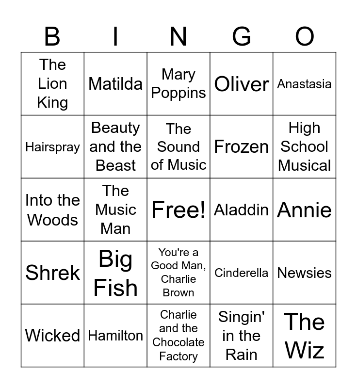 This bingo card has a free space and 24 words: Big Fish, Hamilton, The Sound of Music, Wicked, Anastasia, The Lion King, Hairspray, Matilda, Aladdin, You're a Good Man, Charlie Brown, Frozen, Into the Woods, Cinderella, Newsies, Beauty and the Beast, Singin' in the Rain, Annie, Mary Poppins, High School Musical, The Music Man, The Wiz, Shrek, Oliver and Charlie and the Chocolate Factory.