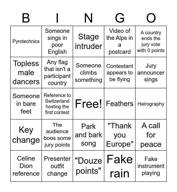 This bingo card has a free space and 29 words: Celine Dion reference, ABBA reference, Reference to Switzerland hosting the first contest, Reference to it being the 69th Eurovision, Pyrotechnics, Stage intruder, Any flag that isn't a participant country, The audience boos some jury points, Feathers, Presenter outfit change, Hairography, Fake instrument playing, "Douze points", Fake rain, Jury announcer sings, Dance break, Park and bark song, Key change, A country ends the jury vote with 0 points, Someone in bare feet, "Thank you Europe", The hosts make one of the contestants visibly uncomfortable, Contestant appears to be flying, Topless male dancers, Video of the Alps in a postcard, Someone sings in poor English, A call for peace, Someone climbs something and "This is _____ calling".