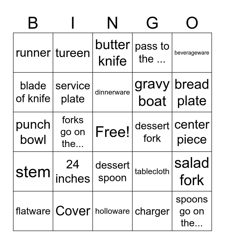 This bingo card has a free space and 24 words: 24 inches, Cover, dinnerware, flatware, beverageware, runner, blade of knife, tureen, dessert fork, dessert spoon, gravy boat, punch bowl, tablecloth, salad fork, service plate, charger, center piece, butter knife, bread plate, forks go on the..., spoons go on the..., stem, pass to the ... and holloware.