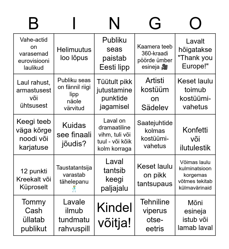 This bingo card has 25 words: 12 punkti Kreekalt või Küproselt, Lavale ilmub tundmatu rahvuspill, Laval on dramaatiline vihm, tuli või tuul - või kõik kolm korraga, Tehniline viperus otse-eetris, Lavalt hõigatakse "Thank you Europe!", Vahe-actid on varasemad eurovisiooni laulikud, Helimuutus loo lõpus, Publiku seas paistab Eesti lipp, Saatejuhtide kolmas kostüümi-vahetus, Võimas laulu kulminatsioon korgemas võtmes tekitab külmavärinaid, Laul rahust, armastusest või ühtsusest, Publiku seas on fännil riigi lipp näole värvitud, Kindel võitja!, Keset laulu on pikk tantsupaus, Keset laulu toimub kostüümi-vahetus, Tommy Cash üllatab publikut, Kuidas see finaali jõudis?, Tüütult pikk jutustamine punktide jagamisel, Artisti kostüüm on Sädelev, Konfetti või ilutulestik, Keegi teeb väga kõrge noodi või karjatuse, Taustatantsija varastab tähelepanu 🕺, Laval tantsib keegi paljajalu, Kaamera teeb 360-kraadi pöörde ümber esineja 🎥 and Mõni esineja istub või lamab laval.