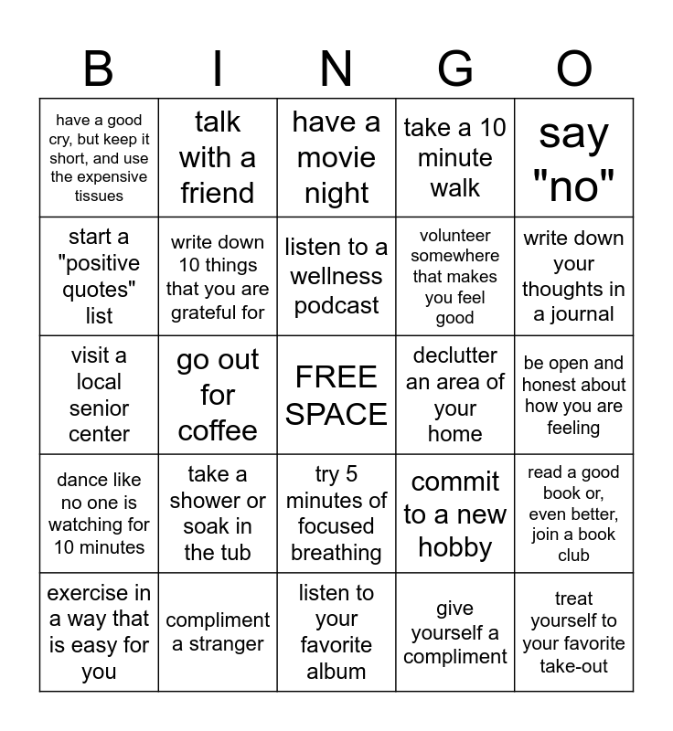 This bingo card has a free space and 24 words: take a shower or soak in the tub, compliment a stranger, listen to a wellness podcast, exercise in a way that is easy for you, say "no", have a good cry, but keep it short, and use the expensive tissues, start a "positive quotes" list, talk with a friend, declutter an area of your home, try 5 minutes of focused breathing, volunteer somewhere that makes you feel good, visit a local senior center, commit to a new hobby, read a good book or, even better, join a book club, write down 10 things that you are grateful for, give yourself a compliment, be open and honest about how you are feeling, have a movie night, write down your thoughts in a journal, go out for coffee, treat yourself to your favorite take-out, dance like no one is watching for 10 minutes, take a 10 minute walk and listen to your favorite album.