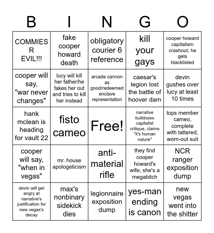 This bingo card has a free space and 24 words: mr. house apologeticism, max's nonbinary sidekick dies, arcade cannon as good/redeemed enclave representation, devin will get angry at narrative's justification for new vegas's decay, cooper howard capitalism crashout; he gets blacklisted, COMMIES R EVIL!!!, cooper will say, "war never changes", fake cooper howard death, narrative bulldozes capitalist critique, claims "it's human nature", anti-material rifle, caesar's legion lost the battle of hoover dam, hank mclean is heading for vault 22, they find cooper howard's wife; she's a megabitch, NCR ranger exposition dump, lucy will kill her father/he fakes her out and tries to kill her instead, yes-man ending is canon, tops member cameo, complete with tattered, worn-out suit, obligatory courier 6 reference, devin gushes over lucy at least 10 times, fisto cameo, new vegas went into the shitter, cooper will say, "when in vegas", kill your gays and legionnaire exposition dump.
