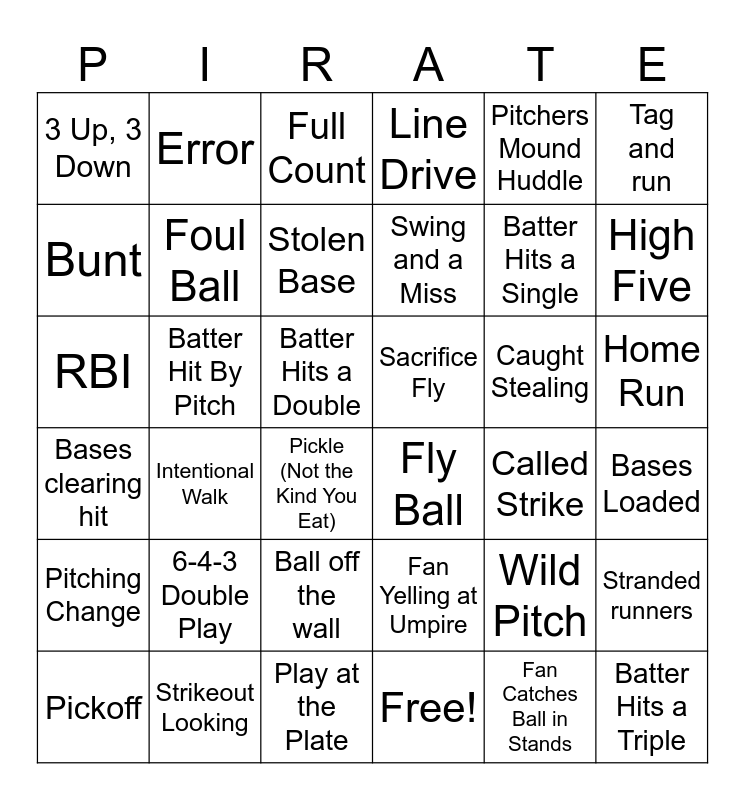 This bingo card has 41 words: Free!, Batter Hits a Single, Runner Slides, Bunt, Fly Ball, Home Run, Foul Ball, Run Scored, Pitchers Mound Huddle, Sacrifice Fly, High Five, Line Drive, RBI, Batter Hits a Double, Batter Hit By Pitch, Caught Stealing, Pickoff, 3 Up, 3 Down, Fan Catches Ball in Stands, Full Count, Intentional Walk, Pitching Change, Called Strike, Stolen Base, Batter Hits a Triple, Wild Pitch, Bases Loaded, Walk, Swing and a Miss, 6-4-3 Double Play, Umpire Dust Home Plate, Error, Pickle (Not the Kind You Eat), Strikeout Looking, Bases clearing hit, Tag and run, Ball off the wall, Stranded runners, Play at the Plate, Fan Yelling at Umpire and Somebody Yelling “Go Ball Go!”.