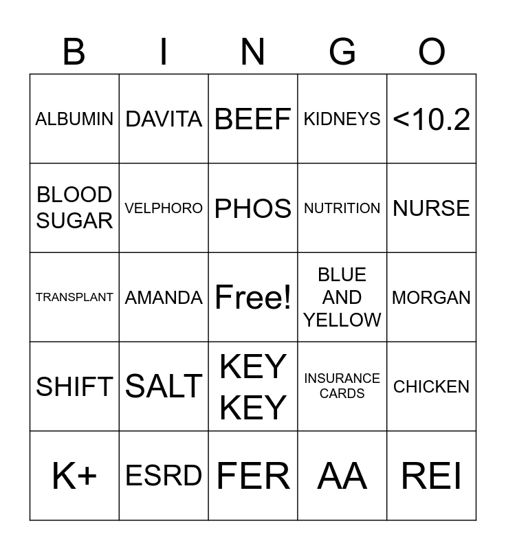 This bingo card has a free space and 24 words: SALT, ESRD, PHOS, K+, <10.2, ALBUMIN, BLOOD SUGAR, DAVITA, BLUE AND YELLOW, KEY KEY, NUTRITION, TRANSPLANT, INSURANCE CARDS, CHICKEN, VELPHORO, AA, MORGAN, BEEF, NURSE, AMANDA, REI, SHIFT, KIDNEYS and FER.