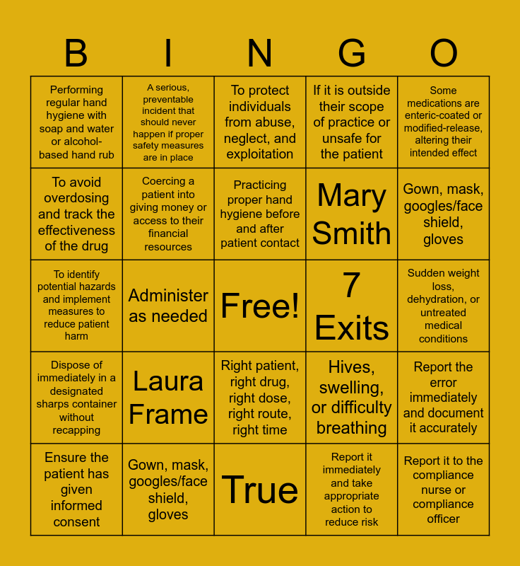 This bingo card has a free space and 24 words: Laura Frame, Gown, mask, googles/face shield, gloves, Practicing proper hand hygiene before and after patient contact, Ensure the patient has given informed consent, Some medications are enteric-coated or modified-release, altering their intended effect, Performing regular hand hygiene with soap and water or alcohol-based hand rub, To avoid overdosing and track the effectiveness of the drug, A serious, preventable incident that should never happen if proper safety measures are in place, 7 Exits, Right patient, right drug, right dose, right route, right time, Mary Smith, To identify potential hazards and implement measures to reduce patient harm, Hives, swelling, or difficulty breathing, Report the error immediately and document it accurately, Coercing a patient into giving money or access to their financial resources, Report it immediately and take appropriate action to reduce risk, Sudden weight loss, dehydration, or untreated medical conditions, To protect individuals from abuse, neglect, and exploitation, Gown, mask, googles/face shield, gloves, Administer as needed, Report it to the compliance nurse or compliance officer, Dispose of immediately in a designated sharps container without recapping, If it is outside their scope of practice or unsafe for the patient and True.