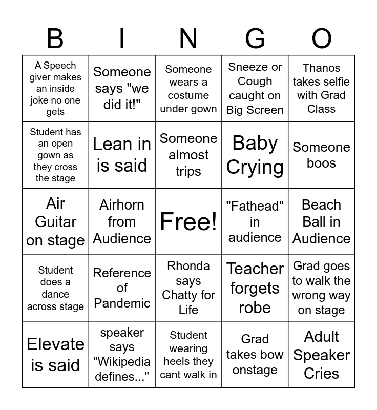 This bingo card has a free space and 39 words: Name Reader messes up a name, Jeffco reimagined is said, better together is said, Lean in is said, Elevate is said, Rhonda says Chatty for Life, Someone almost trips, Student gives Thanos something, Thanos takes selfie with Grad Class, Student does a dance across stage, Airhorn from Audience, Sneeze or Cough caught on Big Screen, Adult Speaker Cries, Beach Ball in Audience, "Fathead" in audience, Reference of Pandemic, Local Landmark is referenced in speech, A Speech giver makes an inside joke no one gets, Something happens with a Bird, Teacher forgets robe, Student has an open gown as they cross the stage, Student wearing heels they cant walk in, Baby Crying, Someone boos, Teacher/Staff wears wildly casual outfit, graduate throws cap early, standing ovation happens, speaker says "next chapter", Someone's cords fall off, Someone says "we did it!", confetti is thrown, someone wears sunglasses on stage, Someone wears a costume under gown, speaker says "Wikipedia defines...", Grad takes bow onstage, A specific teacher is thanked in speech, Grad goes to walk the wrong way on stage, Air Guitar on stage and Cartwheel on stage.