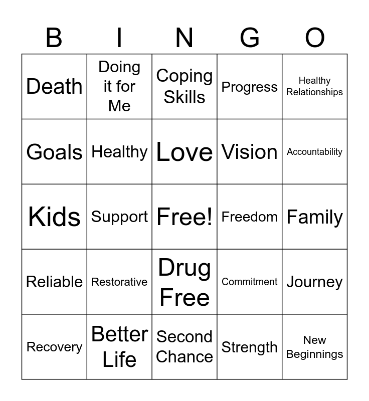 This bingo card has a free space and 34 words: Hard Work, Strength, Self-Dependent, Happiness, Reliable, Healthy, Healthy Relationships, Recovery, Doing it for Me, Positive Enviornment, Love, Coping Skills, Sustainability, Mental Health, Freedom, Accountability, Better Life, Kids, Restorative, Commitment, Drug Free, Money, Death, Family, Second Chance, New Beginnings, Progress, Transformation, Vision, Goals, Rebuild, Support, Journey and Bounce Back.