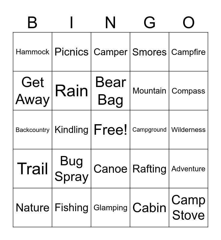 This bingo card has a free space and 36 words: Backpack, Tent, Hike, Rain, Rafting, Trail, Bear Bag, Canoeing, Campfire, Sleeping Bag, Kindling, Smores, Binoculars, Campground, Compass, Hammock, Lantern, Bug Spray, Camp Stove, Camper, Wilderness, Adventure, Fishing, Nature, Glamping, Picnics, Backcountry, Fire, Mountain, Get Away, Touring, Cottage, Cabin, Canoe, Kayak and Exploring.