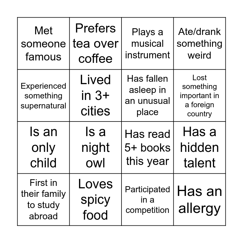 This bingo card has 16 words: Loves spicy food, Has a hidden talent, Plays a musical instrument, Met someone famous, Is an only child, Prefers tea over coffee, Has read 5+ books this year, Participated in a competition, Experienced something supernatural, Lived in 3+ cities, First in their family to study abroad, Ate/drank something weird, Is a night owl, Lost something important in a foreign country, Has fallen asleep in an unusual place and Has an allergy.