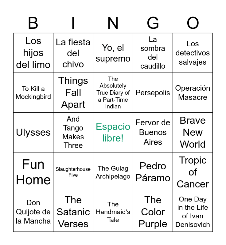 This bingo card has a free space and 29 words: Don Quijote de la Mancha, The Kite Runner, And Tango Makes Three, Antes que anochezca, Los hijos del limo, Yo, el supremo, Things Fall Apart, Slaughterhouse Five, Fervor de Buenos Aires, The Satanic Verses, Brave New World, One Day in the Life of Ivan Denisovich, The Handmaid's Tale, The Color Purple, Operación Masacre, The Well of Loneliness, The Gulag Archipelago, Fun Home, Los detectivos salvajes, Ulysses, Pedro Páramo, Cien años de soledad, Persepolis, To Kill a Mockingbird, La sombra del caudillo, La fiesta del chivo, Tropic of Cancer, The Absolutely True Diary of a Part-Time Indian and Beloved.