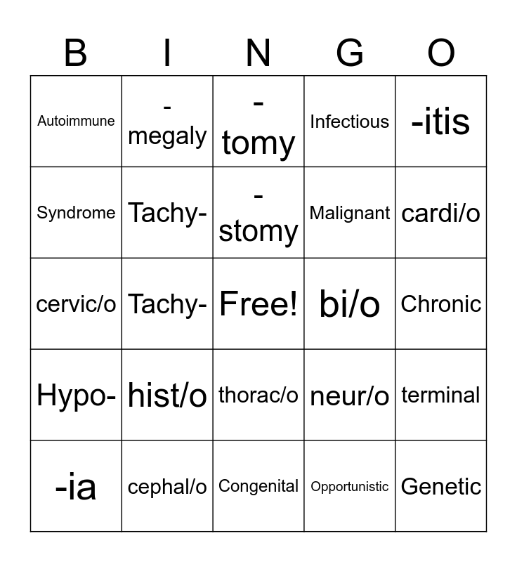This bingo card has a free space and 33 words: A, an, Brady-, Tachy-, Hyper-, Hypo-, Tachy-, -itis, -ia, -megaly, -oma, -stomy, -tomy, anter/o, arthr/o, bi/o, cardi/o, cephal/o, cervic/o, hist/o, neur/o, thorac/o, Acute, Autoimmune, Chronic, Congenital, Genetic, Infectious, Malignant, Syndrome, terminal, Nutritional, Opportunistic and neoplastic.