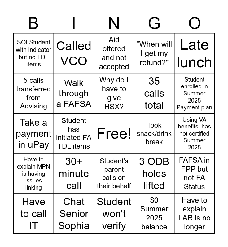 This bingo card has a free space and 24 words: 30+ minute call, Chat Senior Sophia, Why do I have to give HSX?, Have to call IT, Late lunch, SOI Student with indicator but no TDL items, 5 calls transferred from Advising, Called VCO, Took snack/drink break, Student's parent calls on their behalf, 35 calls total, Take a payment in uPay, 3 ODB holds lifted, FAFSA in FPP but not FA Status, Walk through a FAFSA, $0 Summer 2025 balance, Using VA benefits, has not certified Summer 2025, Aid offered and not accepted, Student enrolled in Summer 2025 Payment plan, Student has initiated FA TDL items, Have to explain LAR is no longer, Have to explain MPN is having issues linking, "When will I get my refund?" and Student won't verify.