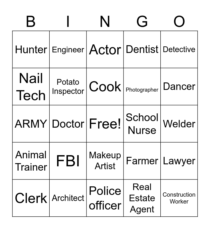 This bingo card has a free space and 24 words: FBI, Architect, Cook, Clerk, Detective, Hunter, Nail Tech, Engineer, School Nurse, Makeup Artist, Photographer, ARMY, Farmer, Lawyer, Potato Inspector, Real Estate Agent, Welder, Actor, Dancer, Doctor, Construction Worker, Animal Trainer, Dentist and Police officer.