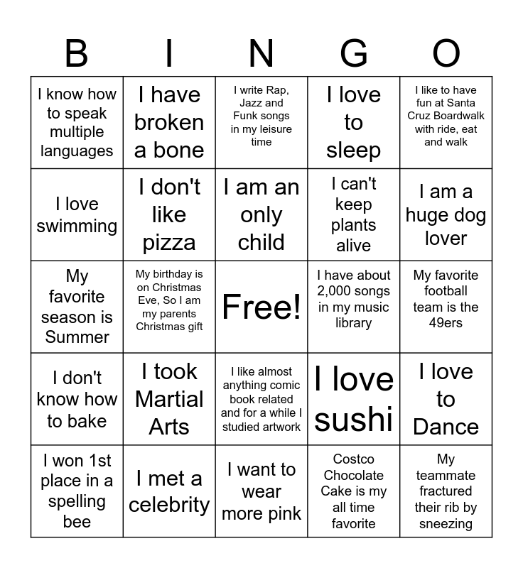 This bingo card has a free space and 24 words: I took Martial Arts, I met a celebrity, I am an only child, I won 1st place in a spelling bee, I like to have fun at Santa Cruz Boardwalk with ride, eat and walk, I know how to speak multiple languages, I love swimming, I have broken a bone, I have about 2,000 songs in my music library, I like almost anything comic book related and for a while I studied artwork, I can't keep plants alive, My favorite season is Summer, I love sushi, I love to Dance, I don't like pizza, Costco Chocolate Cake is my all time favorite, My favorite football team is the 49ers, I write Rap, Jazz and Funk songs in my leisure time, I am a huge dog lover, My birthday is on Christmas Eve, So I am my parents Christmas gift, My teammate fractured their rib by sneezing, I don't know how to bake, I love to sleep and I want to wear more pink.