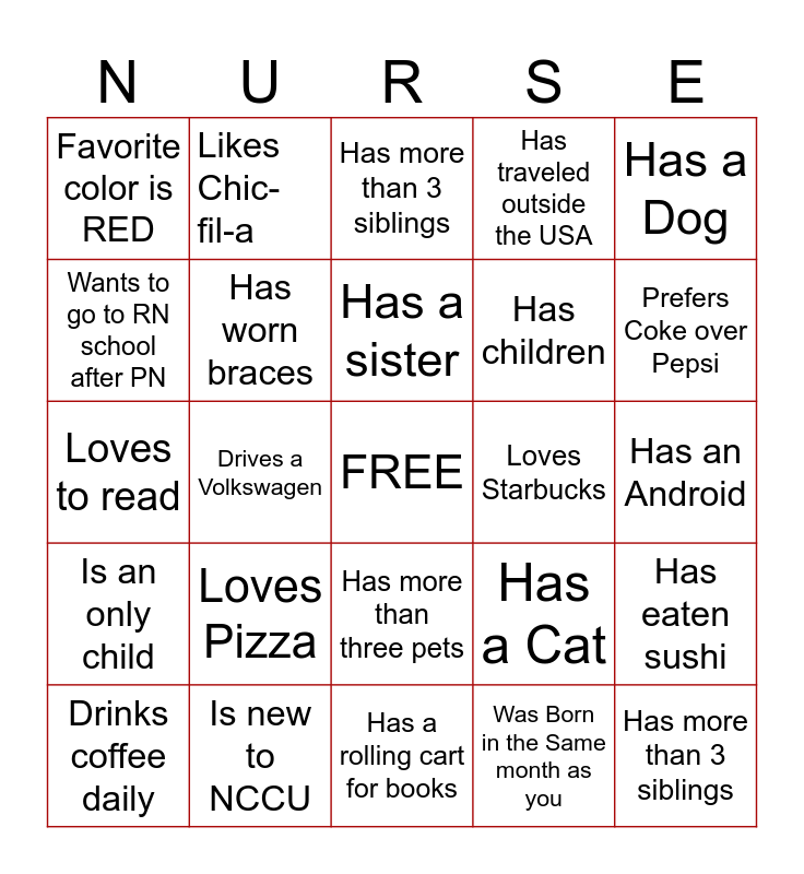 This bingo card has a free space and 34 words: Has green eyes, Was Born in the Same month as you, Plays a Musical Instrument, Was born in another State, Is an only child, Has worn braces, Has a Dog, Drinks coffee daily, Likes Chic-fil-a, Plays a Sport, Has a sister, Has more than 3 siblings, Has a full time job, Has a birthday this month, Loves Starbucks, Prefers Coke over Pepsi, Is new to NCCU, Loves to read, Loves Pizza, Has a Cat, Has more than three pets, Has grandchildren, Favorite color is RED, Has an Android, Has a rolling cart for books, Has more than 3 siblings, Has traveled outside the USA, Has the same favorite TV show as you, Has children, Wants to go to RN school after PN, Is a twin or triplet, Drives a Volkswagen, Has eaten sushi and Loves the beach.