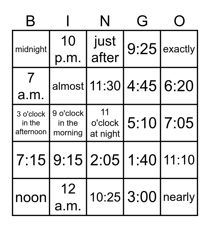 This bingo card has 25 words: 9:15, 10:25, 11:30, noon, exactly, midnight, 7 a.m., 10 p.m., 5:10, 2:05, 4:45, 3 o'clock in the afternoon, 1:40, 11:10, almost, nearly, 7:05, just after, 6:20, 9 o'clock in the morning, 11 o'clock at night, 12 a.m., 7:15, 9:25 and 3:00.