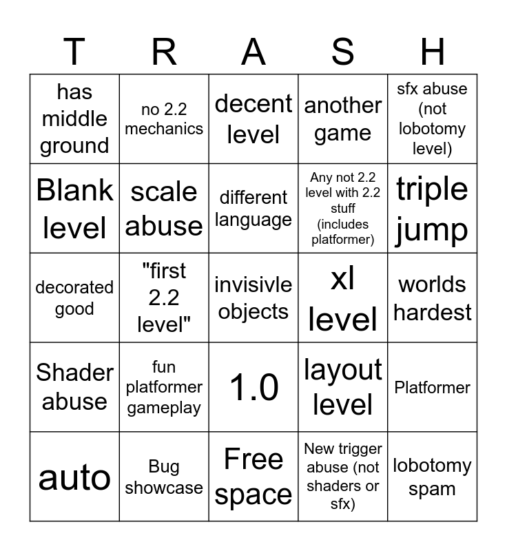 This bingo card has 25 words: Shader abuse, Bug showcase, invisivle objects, New trigger abuse (not shaders or sfx), sfx abuse (not lobotomy level), has middle ground, no 2.2 mechanics, decent level, xl level, Platformer, Blank level, scale abuse, Free space, layout level, triple jump, auto, "first 2.2 level", different language, Any not 2.2 level with 2.2 stuff (includes platformer), worlds hardest, decorated good, fun platformer gameplay, 1.0, another game and lobotomy spam.