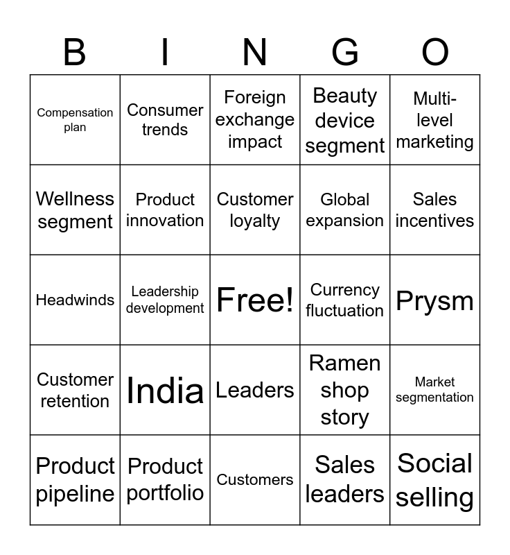 This bingo card has a free space and 60 words: Independent distributors, Product portfolio, Customer acquisition, Customer retention, Sales leaders, Active customers, Product innovation, Digital transformation, Global expansion, Market penetration, Beauty device segment, Skincare segment, Wellness segment, Product launch, Regulatory environment, Compensation plan, Social selling, Multi-level marketing, Distributor engagement, Customer loyalty, Currency fluctuation, Foreign exchange impact, Product pipeline, Market segmentation, Gross margin, Operating margin, Productivity initiatives, Agility Solutions, Sales incentives, Brand affiliates, Anti-aging products, Clinical studies, Recurring revenue, Channel strategy, Consumer trends, Sales volume, Person-to-person marketing, Leadership development, Sustainable growth, Headwinds, Macroeconomic, India, Prysm, Any extreme sport reference, Ramen shop story, Steve Hatchett's Praises, Excitement, Opportunity, Book Reference, Leaders, Customers, Direct Sales, Fortunate, Nu Skin Way, Global Economy, Argentina, South East Asia, Force for Good, The Street and Tariffs.