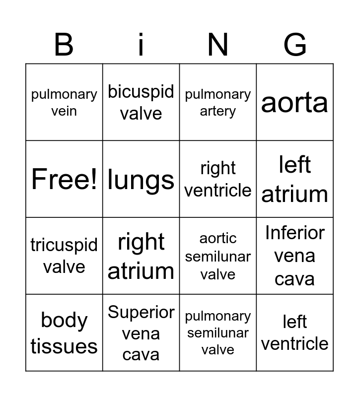 This bingo card has 16 words: Superior vena cava, Inferior vena cava, pulmonary artery, pulmonary vein, tricuspid valve, bicuspid valve, aortic semilunar valve, pulmonary semilunar valve, Free!, lungs, body tissues, aorta, right atrium, left atrium, right ventricle and left ventricle.