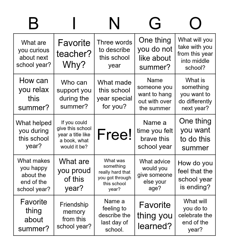 This bingo card has a free space and 24 words: What are you proud of this year?, Friendship memory from this school year?, What made this school year special for you?, Favorite thing about summer?, What will you take with you from this year into middle school?, What are you curious about next school year?, How can you relax this summer?, Favorite teacher? Why?, Name a time you felt brave this school year, What was something really hard that you got through this school year?, Name someone you want to hang out with over the summer, What helped you during this school year?, What advice would you give someone else your age?, How do you feel that the school year is ending?, Who can support you during the summer?, Favorite thing you learned?, One thing you want to do this summer, Three words to describe this school year, What is something you want to do differently next year?, If you could give this school year a title like a book, what would it be?, What will you do to celebrate the end of the year?, What makes you happy about the end of the school year?, One thing you do not like about summer? and Name a feeling to describe the last day of school..