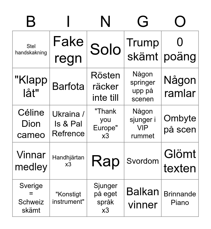 This bingo card has a free space and 24 words: Handhjärtan x3, "Konstigt instrument", Rösten räcker inte till, Sverige = Schweiz skämt, 0 poäng, Stel handskakning, "Klapp låt", Fake regn, Någon sjunger i VIP rummet, Rap, Någon springer upp på scenen, Céline Dion cameo, Svordom, Glömt texten, Barfota, Balkan vinner, Ombyte på scen, Solo, Någon ramlar, Ukraina / Is & Pal Refrence, Brinnande Piano, Vinnar medley, Trump skämt and Sjunger på eget språk x3.
