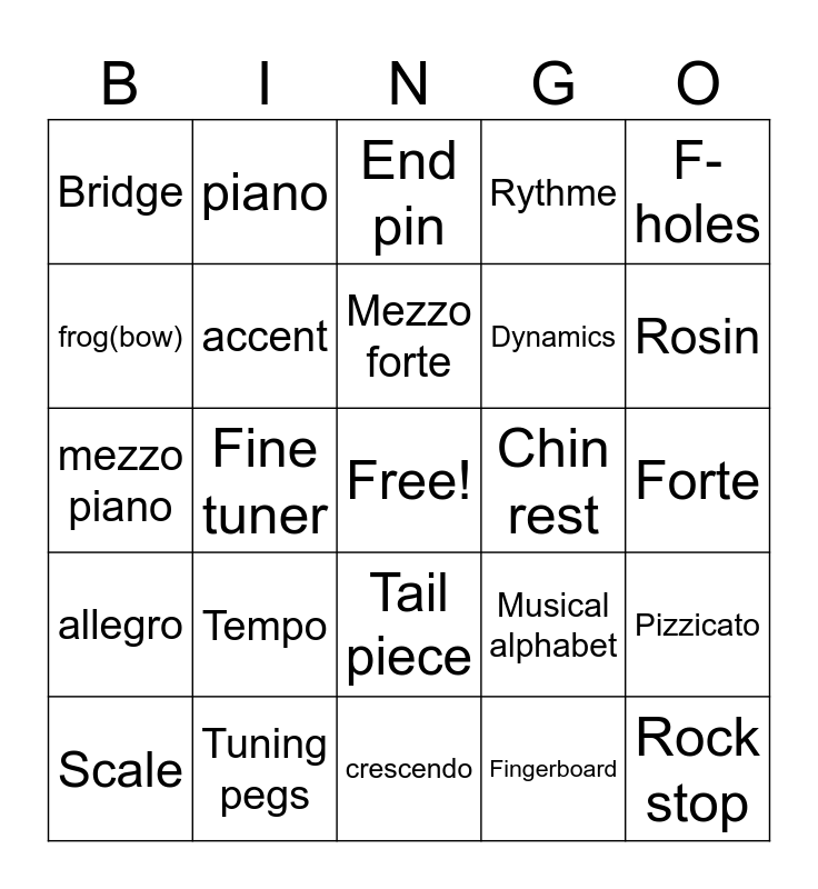 This bingo card has a free space and 24 words: Tempo, Tuning pegs, Mezzo forte, Scale, F-holes, Bridge, frog(bow), piano, Chin rest, Tail piece, Dynamics, mezzo piano, Musical alphabet, Pizzicato, accent, Fingerboard, Forte, End pin, Rosin, Fine tuner, Rock stop, allegro, Rythme and crescendo.