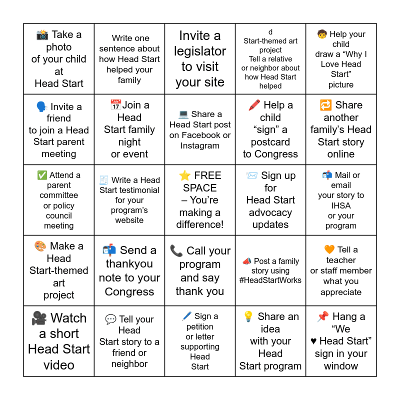 This bingo card has a free space and 24 words: π¬ Send a thankyou note to your Congress, π¬ Tell your Head Start story to a friend or neighbor, π» Share a Head Start post on Facebook or Instagram, π₯ Watch a short Head Start video, π§ Help your child draw a βWhy I Love Head Startβ picture, πΈ Take a photo of your child at Head Start, π£ Invite a friend to join a Head Start parent meeting, οΈ Write one sentence about how Head Start helped your family, π¨ Sign up for Head Start advocacy updates, π Call your program and say thank you, π Help a child βsignβ a postcard to Congress, β Attend a parent committee or policy council meeting, π£ Post a family story using #HeadStartWorks, π§‘ Tell a teacher or staff member what you appreciate, π Join a Head Start family night or event, π‘ Share an idea with your Head Start program, π¬ Mail or email your story to IHSA or your program, Invite a legislator to visit your site, π Share another familyβs Head Start story online, π§Ύ Write a Head Start testimonial for your programβs website, π Hang a βWe β₯ Head Startβ sign in your window, π¨ Make a Head Start-themed art project, d Start-themed art project Tell a relative or neighbor about how Head Start helped and π Sign a petition or letter supporting Head Start.