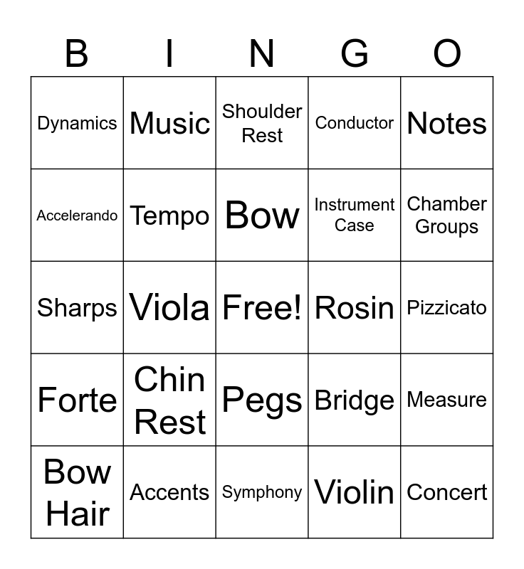 This bingo card has a free space and 32 words: Violin, Bass, Viola, Cello, Forte, Tempo, Notes, Measure, Music, Orchestra, Bow, Shoulder Rest, Rock Stop, Music Stand, Rosin, Strings, Bow Hair, Sharps, Pegs, Chin Rest, Bridge, Scales, Pizzicato, Accents, Concert, Conductor, Instrument Case, Accelerando, Dynamics, Symphony, Chamber music and Chamber Groups.