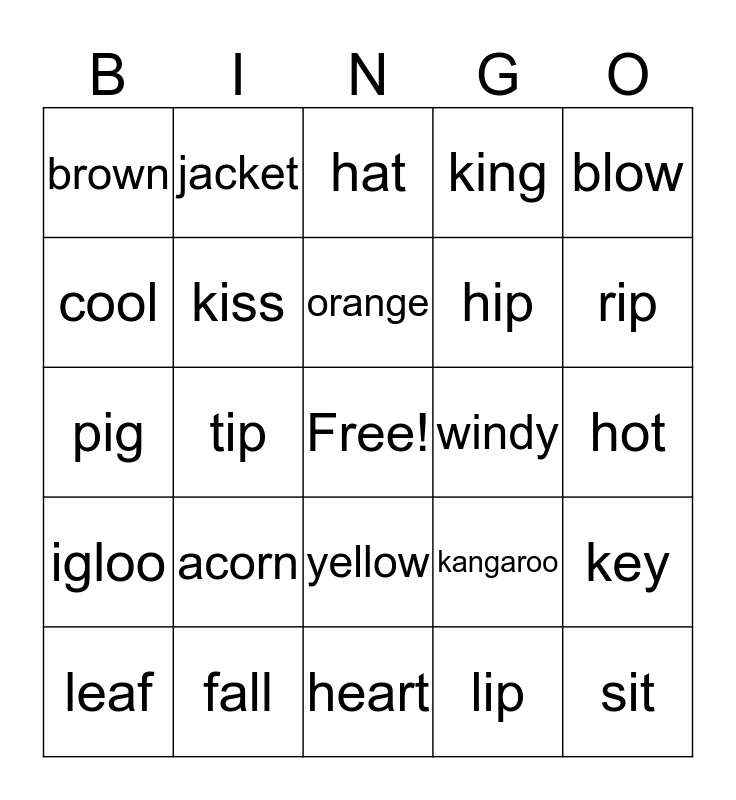 This bingo card has a free space and 24 words: acorn, fall, orange, leaf, blow, brown, cool, jacket, windy, yellow, hip, pig, kangaroo, key, kiss, lip, hot, hat, rip, tip, sit, igloo, king and heart.