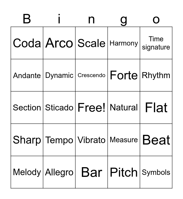 This bingo card has a free space and 24 words: Tempo, Allegro, Crescendo, Melody, Time signature, Coda, Andante, Arco, Natural, Vibrato, Forte, Section, Measure, Beat, Dynamic, Pitch, Flat, Scale, Rhythm, Sticado, Symbols, Sharp, Harmony and Bar.