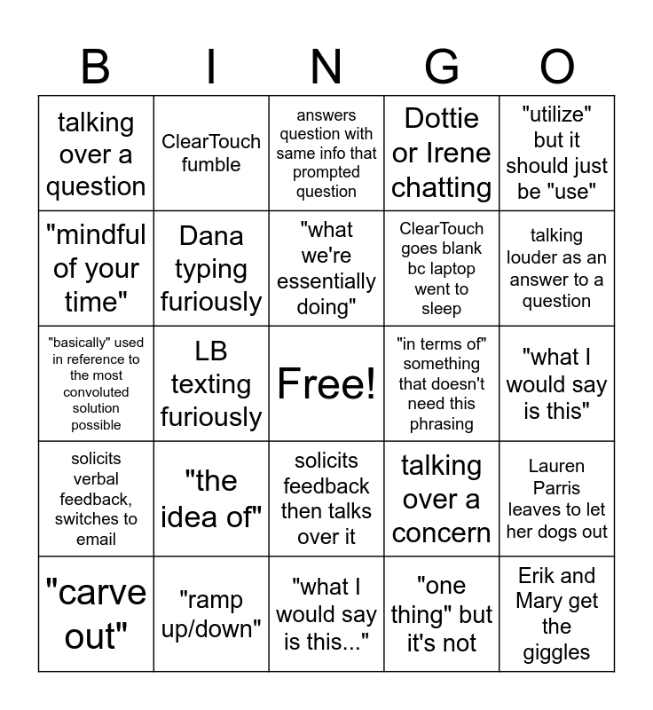 This bingo card has a free space and 24 words: "the idea of", "ramp up/down", "what we're essentially doing", "carve out", "utilize" but it should just be "use", talking over a question, "mindful of your time", ClearTouch fumble, "in terms of" something that doesn't need this phrasing, solicits feedback then talks over it, ClearTouch goes blank bc laptop went to sleep, "basically" used in reference to the most convoluted solution possible, talking over a concern, Lauren Parris leaves to let her dogs out, Dana typing furiously, "one thing" but it's not, "what I would say is this", answers question with same info that prompted question, talking louder as an answer to a question, LB texting furiously, Erik and Mary get the giggles, solicits verbal feedback, switches to email, Dottie or Irene chatting and "what I would say is this...".