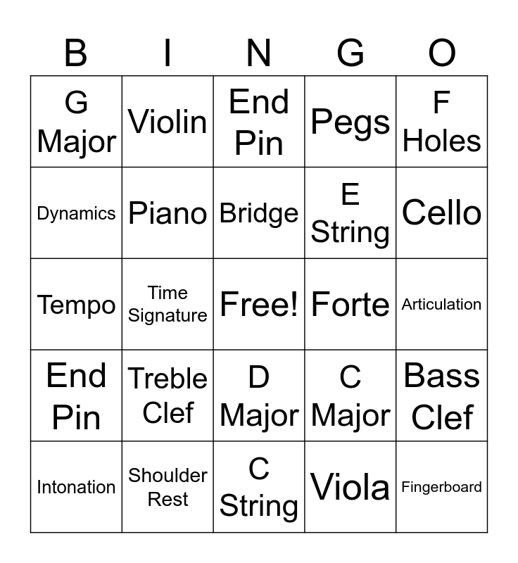 This bingo card has a free space and 24 words: Treble Clef, Shoulder Rest, Bridge, Intonation, F Holes, G Major, Dynamics, Violin, Forte, D Major, E String, Tempo, C Major, Bass Clef, Piano, Viola, Articulation, End Pin, Cello, Time Signature, Fingerboard, End Pin, Pegs and C String.